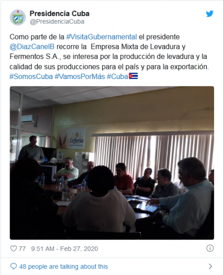 Díaz-Canel llegó también hasta la Empresa Mixta de Levadura y Fermentos S.A., donde constató detalles sobre la producción de levadura y la calidad de sus producciones para el país y para la exportación.